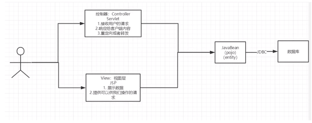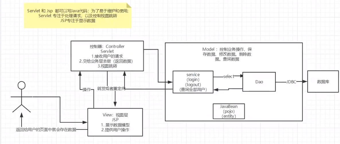 servlet的代码中;处理请求、响应、视图跳转、处理JDBC、处理业务代码、处理国际代码。。。