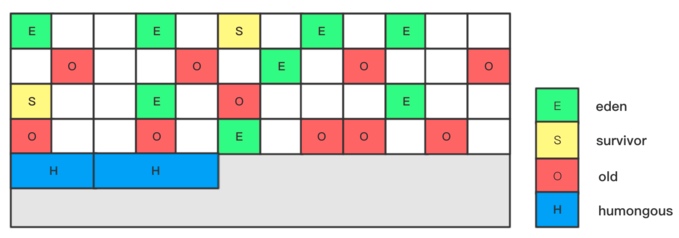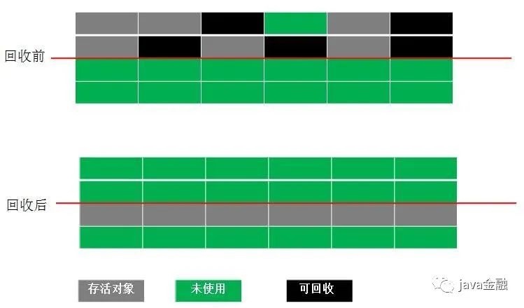 从图中我们就可以发现,该算法最大的问题是内存碎片化严重,后续可能发生大对象不能找到可利用空间