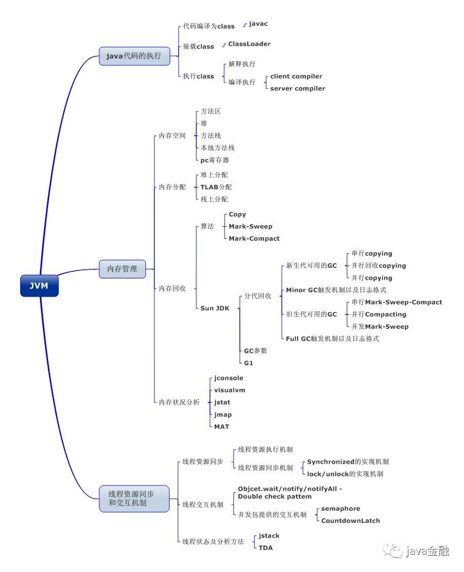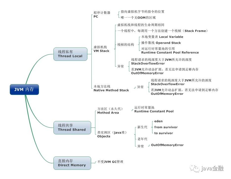 JVM 内存区域主要分为线程私有区域【程序计数器、虚拟机栈、本地方法区】、线程共享区域【JAVA