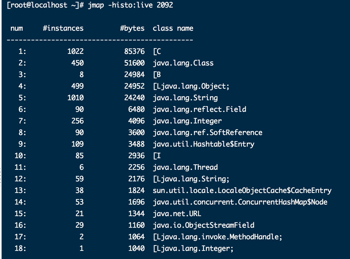 3.jmap -histo:live +pid 可以查看当前Java进程创建的活跃对象数目和占用内存大小。
