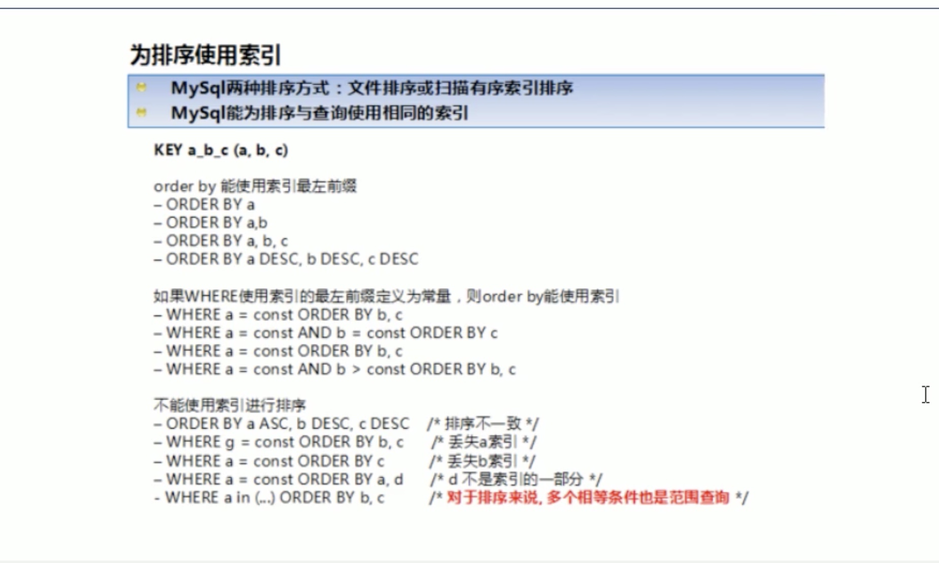 1.定值、范围还是排序,一般order by是给个范围 索引本来就有排序功能