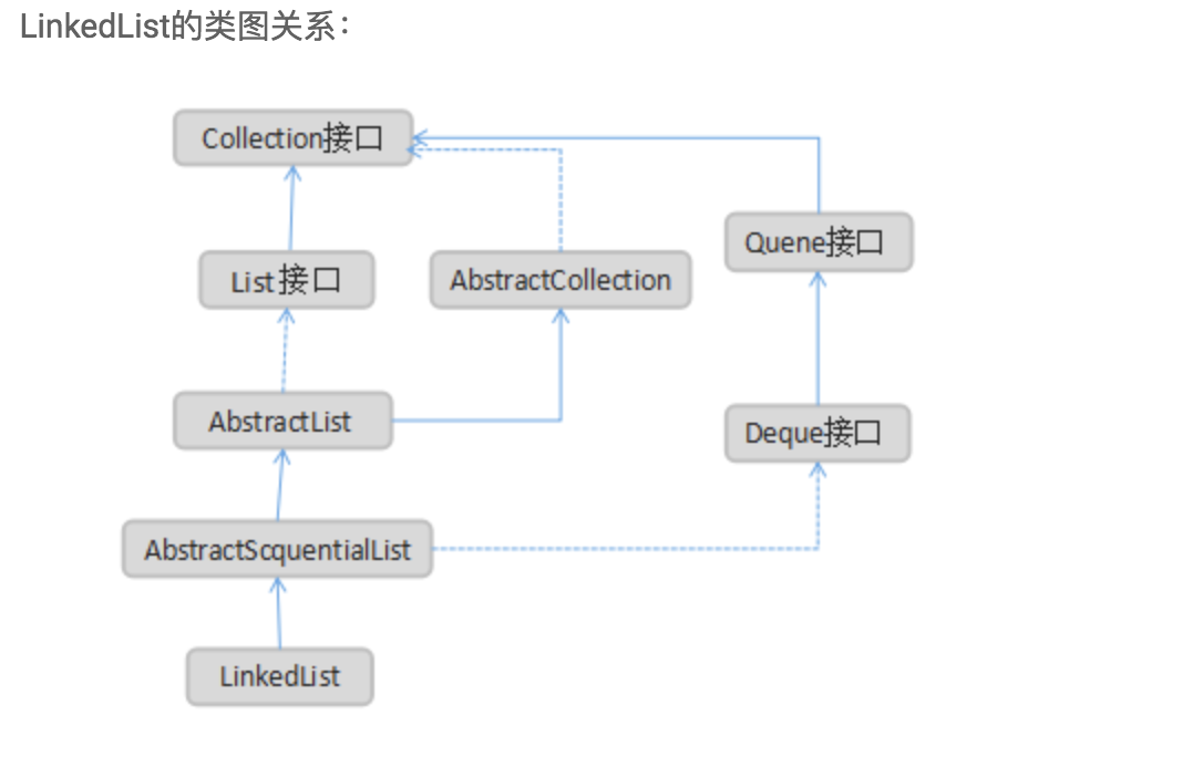 LinkedList 是一个继承于AbstractSequentialList的双向链表。它也可以被当作堆栈、队列或双端队列进行操作。