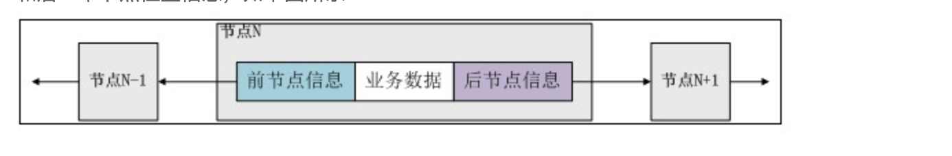 既然是双向链表,那么必定存在一种数据结构——我们可以称之为节点,节点实例保存业务数据,前一个节点的位置信息和后一个节点位置信息,如下图所示: