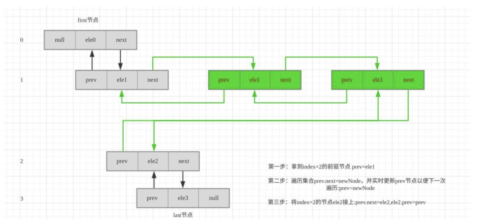 将集合c添加到链表,如果不传index,则默认是添加到尾部。如果调用addAll(int index, Collection<? extends E> c)方法,则添加到index后面。