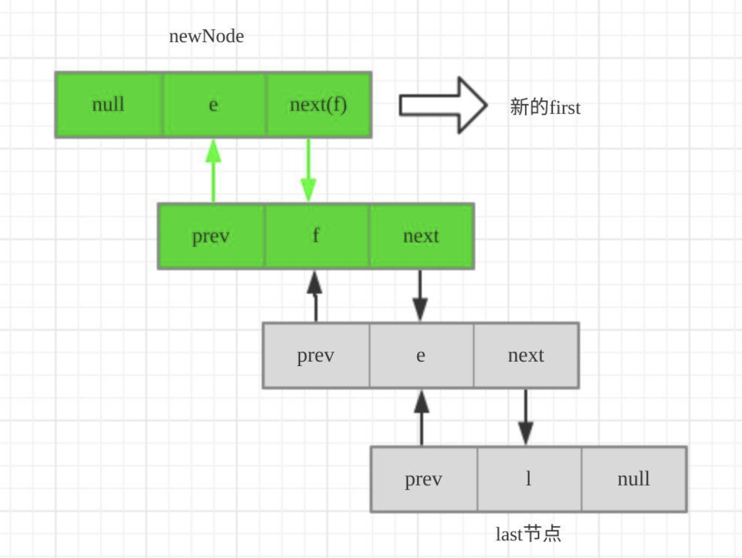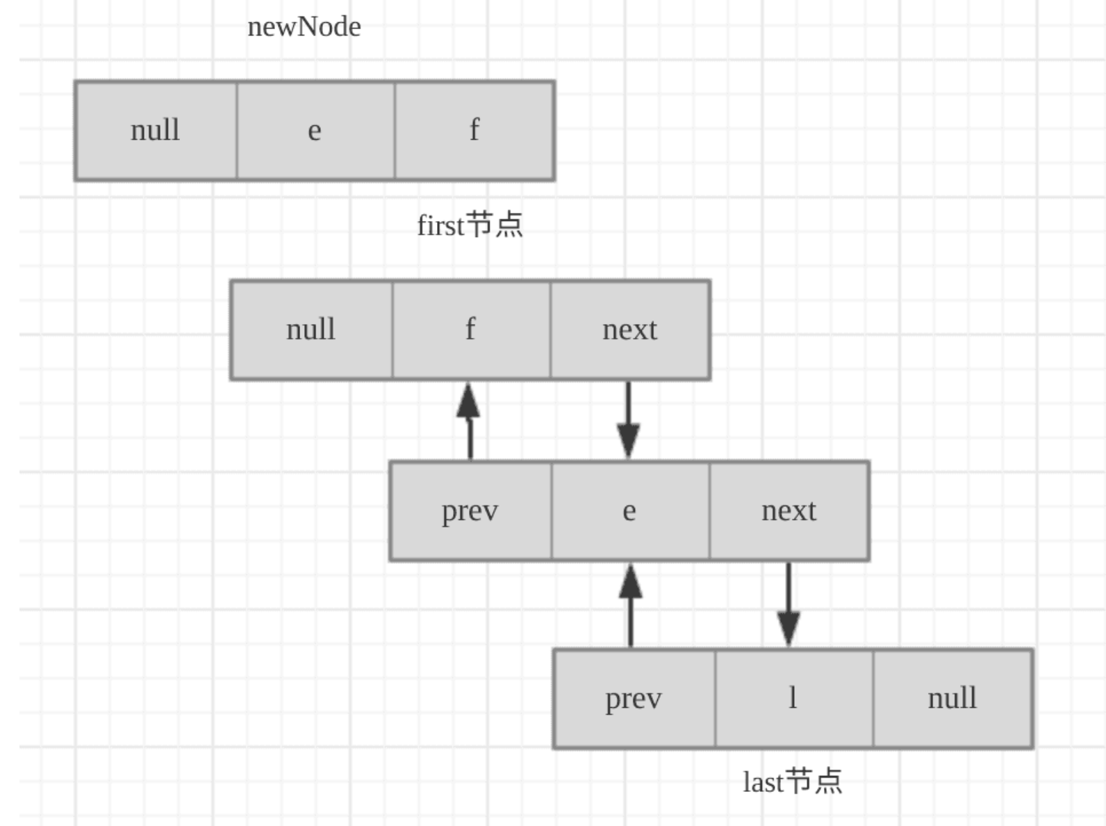 // 前置节点为pred,后置节点为null,当前节点值为e的节点newNode