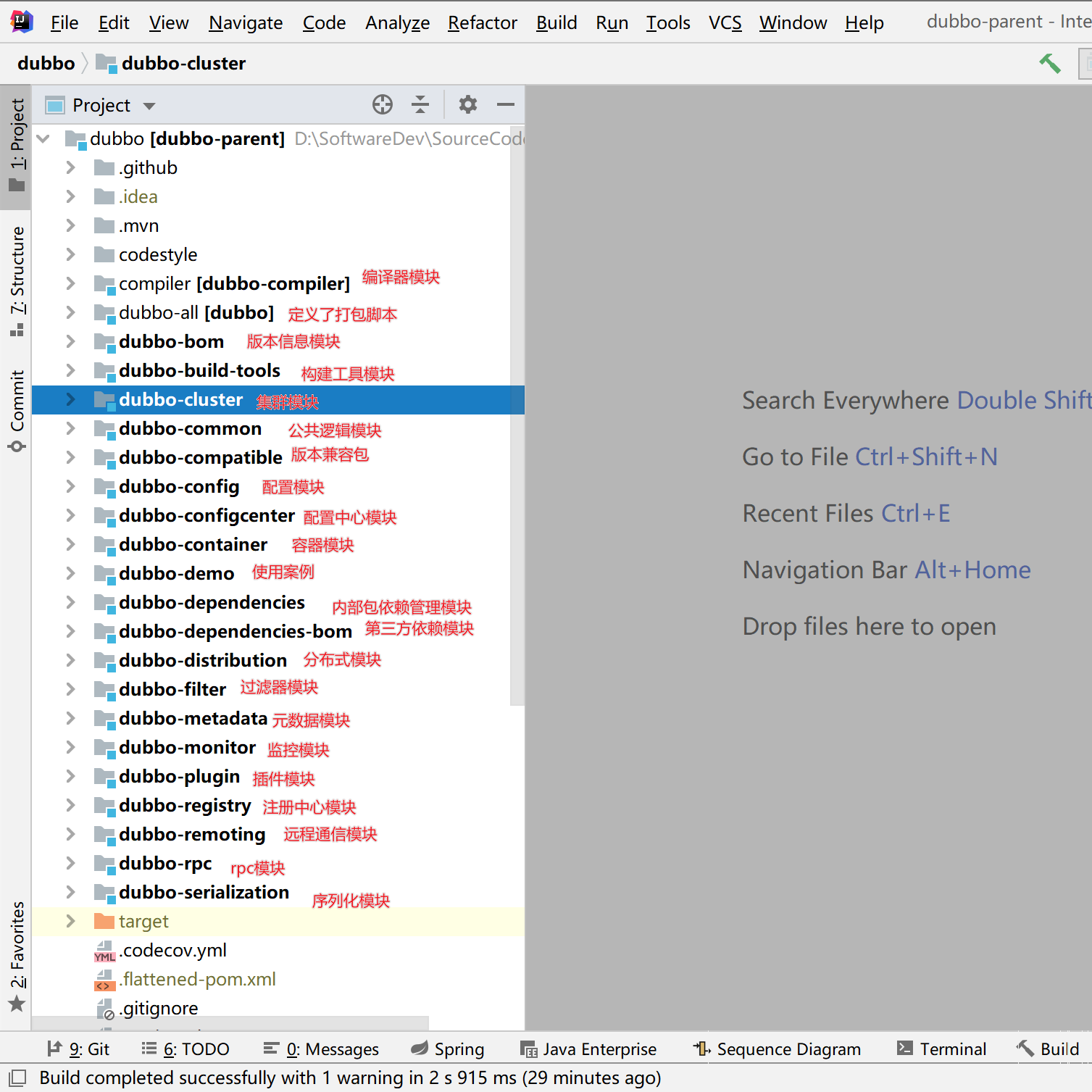 这里官网的模块说明 现在dubbo最新的版本是2.7.8,模块的划分更细。如下图展示各个模块作用。