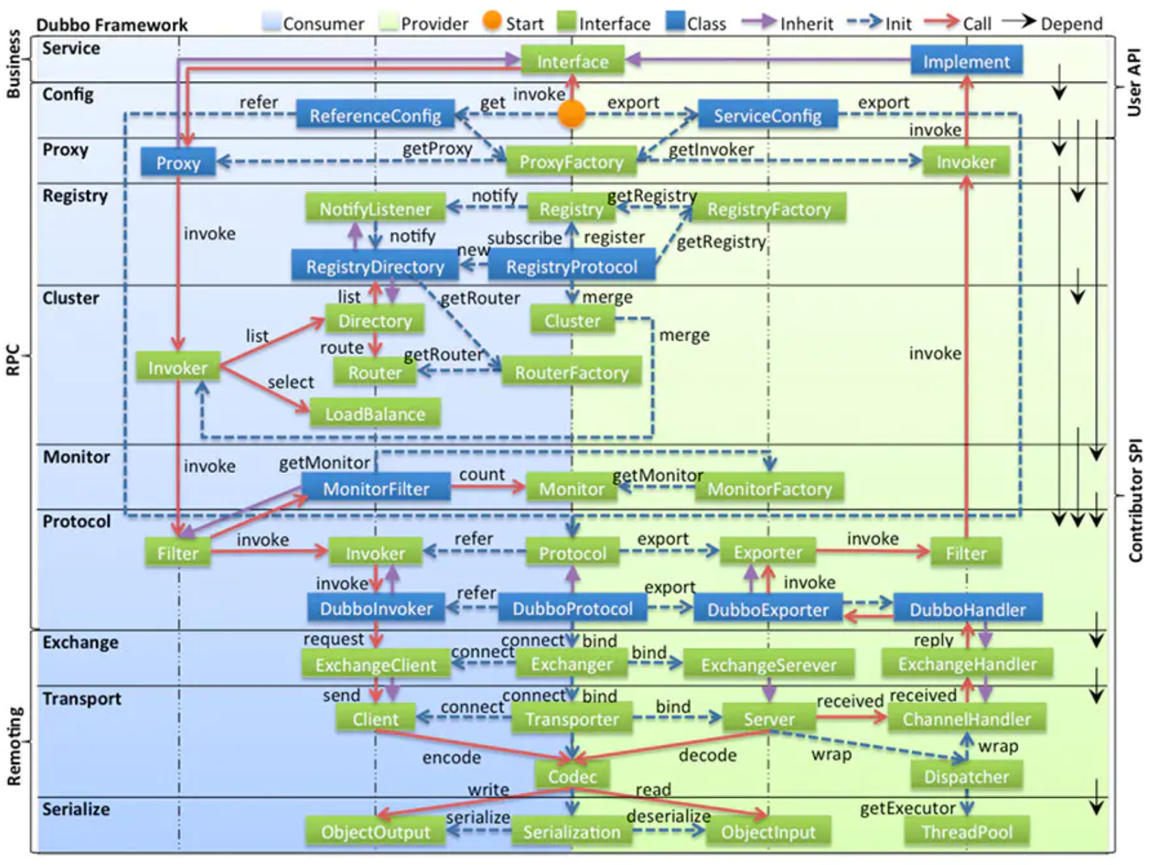 - 图中左边淡蓝背景的为服务消费方使用的接口,右边淡绿色背景的为服务提供方使用的接口,位于中轴线上的为双方都用到的接口。