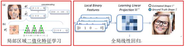 所谓的级联,即当前函数fi的输入依赖于上一级函数fi-1的输出θi-1,而每一个fi的学习目标都是逼近特征点的真实位置θ,θ0为初始形状。通常情况,fi不是直接回归真实位置θ,而回归当前形状θi-1与真实位置θ之间的差:Δθi = θ - θi-1。