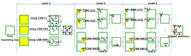 下图是深度置信网络(DBN):建模不同表情下的人脸形状变化的示意图。 香港中文大学唐晓鸥教授的课题组在CVPR 2013上提出3级卷积神经网络DCNN来实现面部特征点定位的方法。该方法也可以统一在级联形状回归模型的大框架下,和CPR、RCPR、SDM、LBF等方法不一样的是,DCNN使用深度模型-卷积神经网络,来实现fi。第一级f1使用人脸图像的三块不同区域(整张人脸,眼睛和鼻子区域,鼻子和嘴唇区域)作为输入,分别训练3个卷积神经网络来预测特征点的位置,网络结构包含4个卷积层,3个Pooling层和2个全连接层,并融合三个网络的预测来得到更加稳定的定位结果。后面两级f2, f3在每个特征点附近抽取特征,针对每个特征点单独训练一个卷积神经网络(2个卷积层,2个Pooling层和1个全连接层)来修正定位的结果。该方法在LFPW数据集上取得当时最好的定位结果。