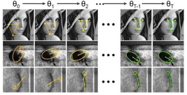 这项技术的应用很广泛,比如自动人脸识别,表情识别以及人脸动画自动合成等。由于不同的姿态、表情、光照以及遮挡等因素的影响,准确地定位出各个关键特征点看似很困难。我们简单地分析一下这个问题,不难发现这个任务其实可以拆分出三个子问题: 1. 如何对人脸表观图像(输入)建模 2. 如何对人脸形状(输出)建模 3.如何建立人脸表观图像(模型)与人脸形状(模型)的关联 以往的研究工作也离不开这三个方面。人脸形状建模典型的方法有可变形模板(Deformable Template)、点分布模型(主动形状模型Active Shape Model)、图模型等。 人脸表观建模又可分为全局表观建模和局部表观建模。全局表观建模简单的说就是考虑如何建模整张人脸的表观信息,典型的方法有主动表观模型Active Appearance Model(产生式模型)和Boosted Appearance Model(判别式模型)。对应的局部表观建模则是对局部区域的表观信息建模,包括颜色模型、投影模型、侧剖线模型等。 近来,级联形状回归模型在特征点定位任务上取得了重大突破,该方法使用回归模型,直接学习从人脸表观到人脸形状(或者人脸形状模型的参数)的映射函数,进而建立从表观到形状的对应关系。此类方法不需要复杂的人脸形状和表观建模,简单高效,在可控场景(实验室条件下采集的人脸)和非可控场景(网络人脸图像等)均取得不错的定位效果。此外,基于深度学习的面部特征点定位方法也取得令人瞩目的结果。深度学习结合形状回归框架可以进一步提升定位模型的精度,成为当前特征定位的主流方法之一。下面我将具体介绍级联形状回归和深度学习这两大类方法的研究进展。级联线性回归模型 面部特征点定位问题可以看作是学习一个回归函数F,以图象I作为输入,输出θ为特征点的位置(人脸形状):θ = F(I)。 简单的说,级联回归模型可以统一为以下框架:学习多个回归函数{f1 ,…, fn-1, fn}来逼近函数F: