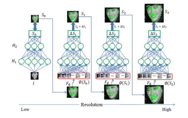 2. 函数fi的目标也与当前的人脸形状θi-1相关,即fi的优化目标为当前形状θi-1与真实位置θ之间的差Δθi。
