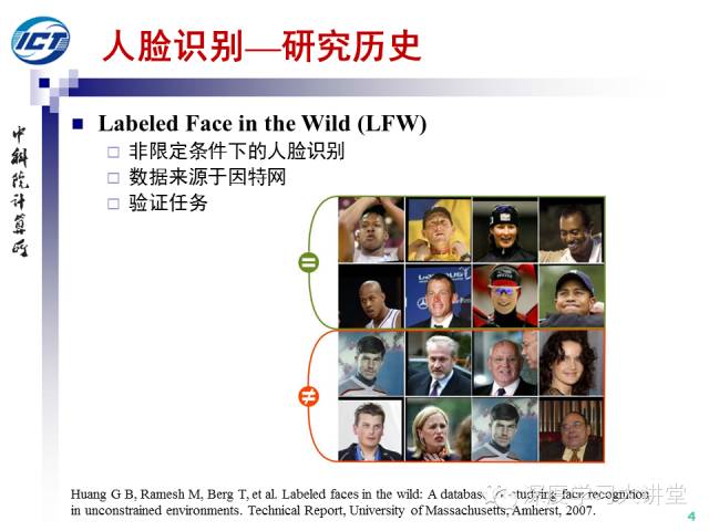 2007年以来,LFW数据库成为事实上的真实条件下的人脸识别问题的测试基准。LFW数据集包括来源于因特网的5,749人的13,233张人脸图像,其中有1680人有两张或以上的图像。LFW的标准测试协议包括6000对人脸的十折确认任务,每折包括300对正例和300对反例,采用十折平均精度作为性能评价指标。