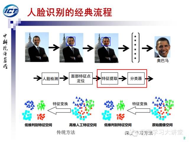 在深度学习出现以前,人脸识别方法一般分为高维人工特征提取(例如:LBP, Gabor等)和降维两个步骤,代表性的降维方法有PCA, LDA等子空间学习方法和LPP等流行学习方法。在深度学习方法流行之后,代表性方法为从原始的图像空间直接学习判别性的人脸表示。