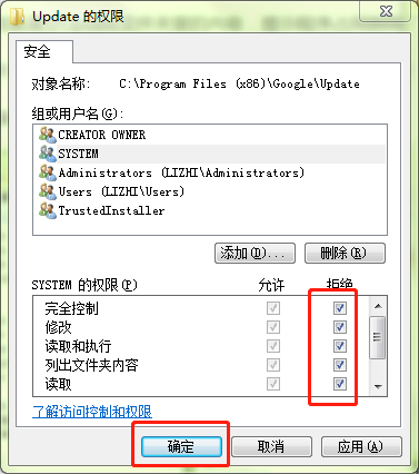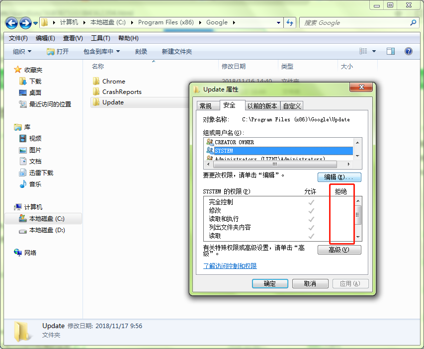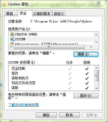 - 接下来右键Update文件夹,属性里的安全页签里点击编辑,设置system完全控制权设置为拒绝。System是最高权限,设置完了之后google就没有权限动这个文件了。