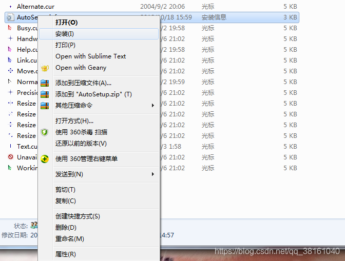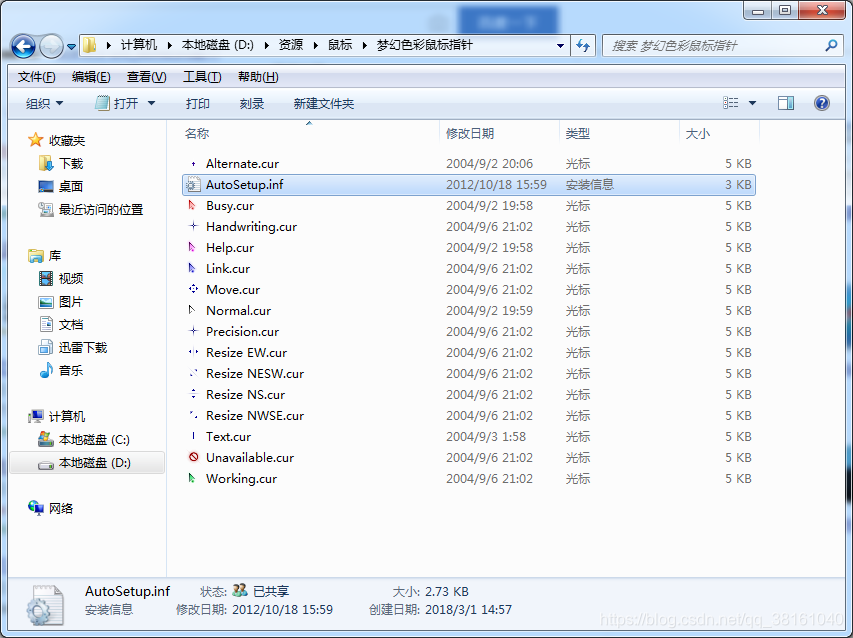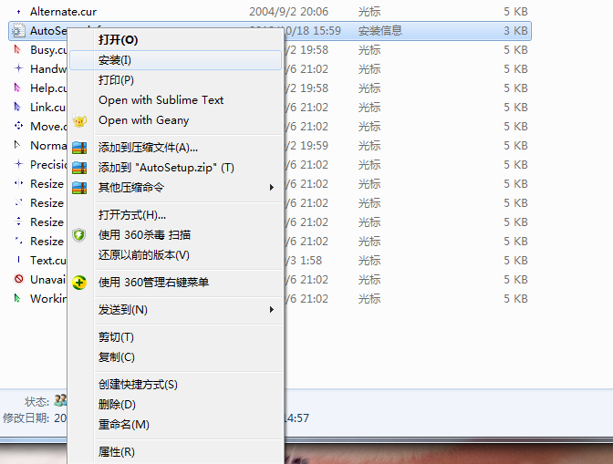 1.在网上下载一个鼠标指针包,解压后在里面找到*.inf格式的文件,
