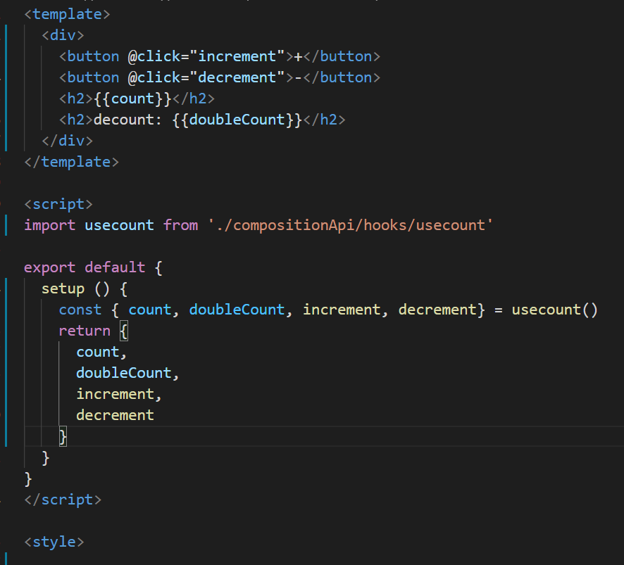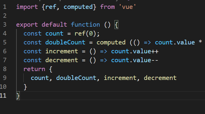 一个简单计数器的案例,相比较于vue2中Options Api,这样的代码逻辑更加紧凑,不用再像以前一样到处去找逻辑代码。