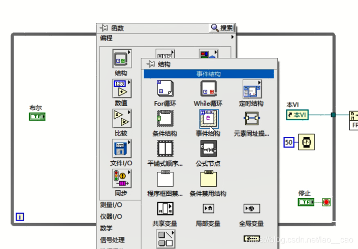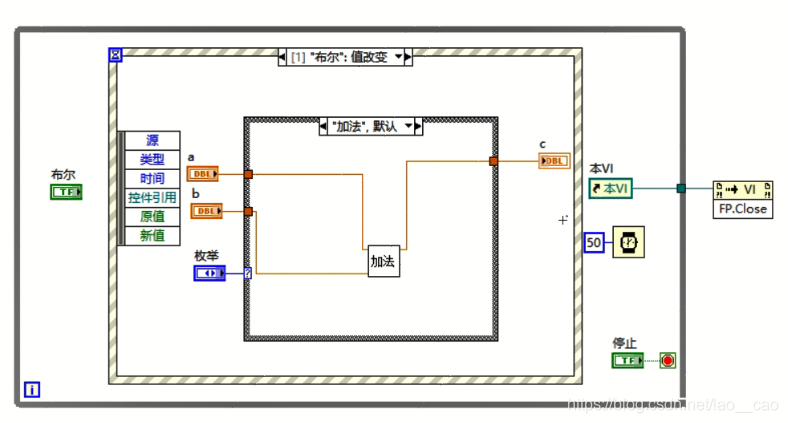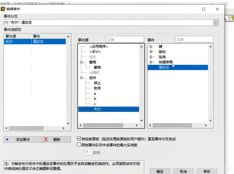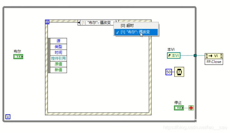 鼠标点击事件结构上方的黑下三角,显示有超时和布尔值改变两个事件分支,我们选中布尔值改变的事件分支,在该分支添加相关的程序逻辑。