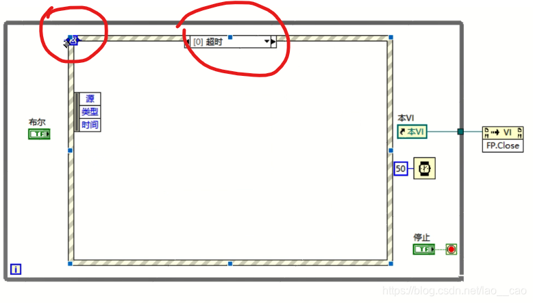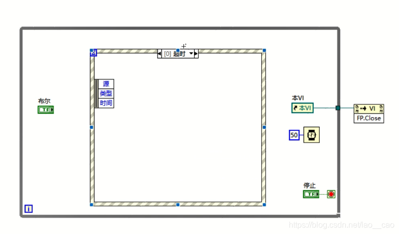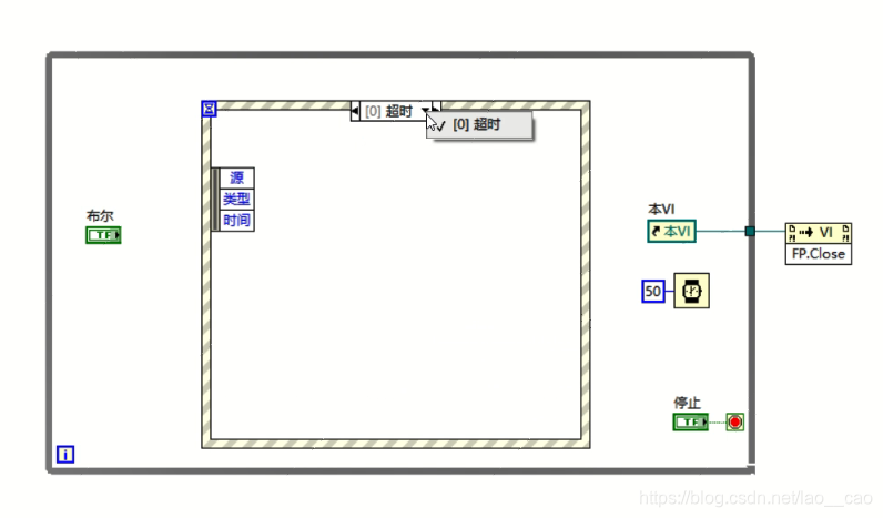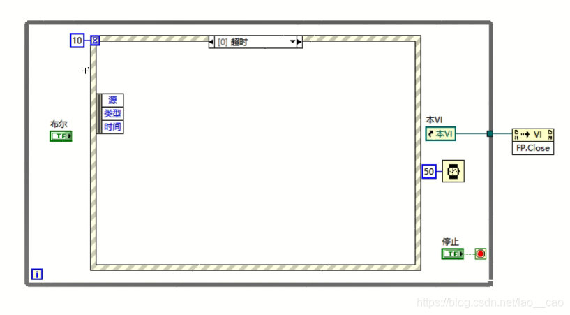 当其他事件不发生时,我们又希望程序继续执行事件结构之外或事件之外的逻辑的话,我们可以在事件机构左侧输入超时时间,一旦超过这个时间程序没有执行其他操作的话,则执行一次超时事件,这样在事件响应超时的情况下就可以执行一次while循环了。