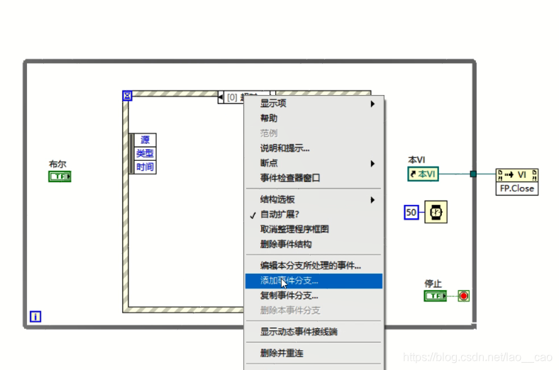 3、添加“布尔”按键的事件,鼠标移到事件结构上方的事件显示图标,右键选择“添加事件分支”。