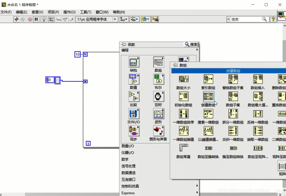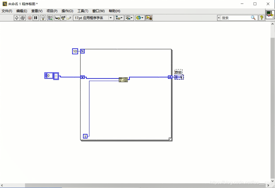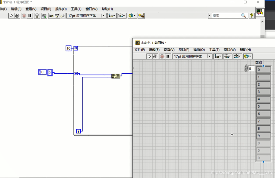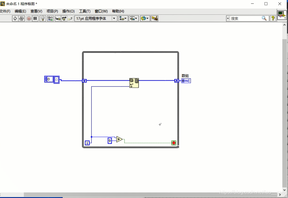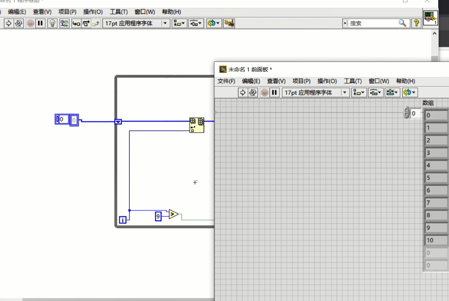 6、按如下接线连接,i索引就是循环中的执行次数,从0开始的。右键创建一个输出控件,运行后可以在前面板看到一个新建好的从1到9的数组。