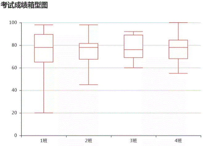 from pyecharts import Boxplot x =['1班','2班','3班','4班'] y1=[78, 98, 56, 78, 90.0, 45, 78, 20, 87, 86, 74, 89, 94] y2=[89, 82, 45, 67, 68, 78.0, 79, 98, 71, 56, 78, 81, 80] y3=[90, 80, 60, 89, 76, 73.0, 72, 92, 89, 87, 65, 66, 76] y4=[82, 72, 55, 100, 90.0, 78, 69, 67, 87, 66, 78, 71, 82] box = Boxplot(title = '考试成绩箱型图',width = 600,height = 420) # 预处理数据计算最大值,最小值,中位数以及上下四分位数 y_prepared = box.prepare_data([y1,y2,y3,y4]) box.add(name = '',x_axis = x,y_axis = y_prepared)