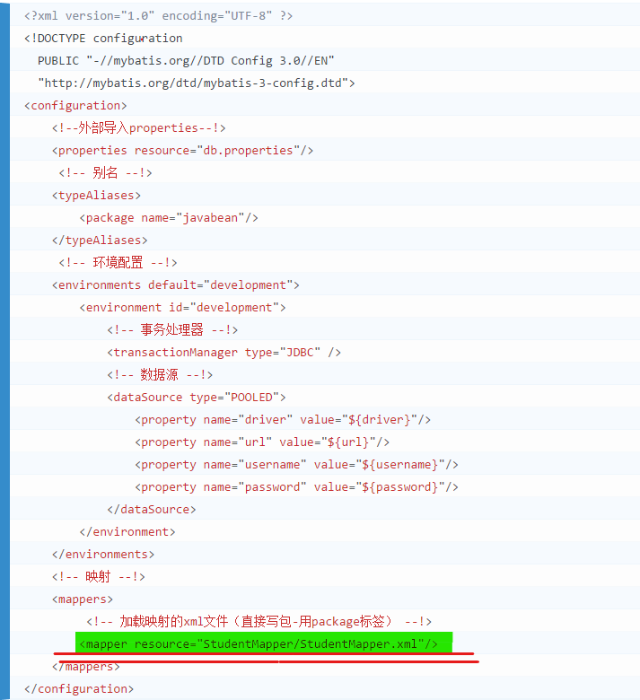 <?xml version="1.0" encoding="UTF-8" ?> <!DOCTYPE configuration PUBLIC "-//mybatis.org//DTD Config 3.0//EN" "http://mybatis.org/dtd/mybatis-3-config.dtd"> <configuration> <!--外部导入properties--!> <properties resource="db.properties"/> <!-- 别名 --!> <typeAliases> <package name="javabean"/> </typeAliases> <!-- 环境配置 --!> <environments default="development"> <environment id="development"> <!-- 事务处理器 --!> <transactionManager type="JDBC" /> <!-- 数据源 --!> <dataSource type="POOLED"> <property name="driver" value="${driver}"/> <property name="url" value="${url}"/> <property name="username" value="${username}"/> <property name="password" value="${password}"/> </dataSource> </environment> </environments> <!-- 映射 --!> <mappers> <!-- 加载映射的xml文件(直接写包-用package标签) --!> <mapper resource="StudentMapper/StudentMapper.xml"/> </mappers> </configuration>