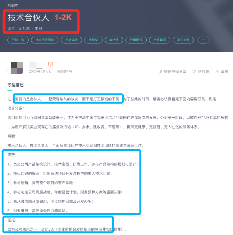然后看要求:技术要一把手主观定义产品技术架构、核心代码编写、战略发展规划。其中创业艰难,需要承受压力和风险,就是996呗,还要自己解决团队建设等问题。要求必然高,不然还真体现不出来这是一家巨有发展前景的未来上市公司。