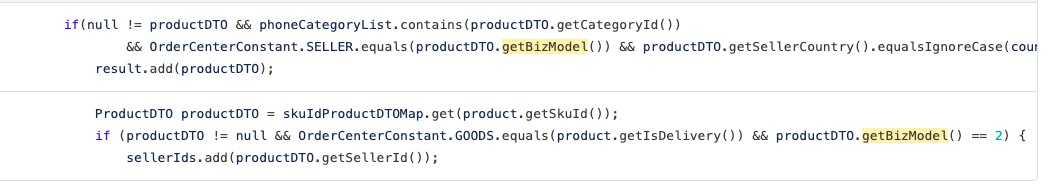 * 商品模型中的bizModel(直营 / 平台 / 供应商独占),三种类型,虽然提供了枚举类,但代码中还是随处可见:if (product.getBizModel() == 2); 像这种枚举值比较少的,建议采用对枚举的再次封装的方式。