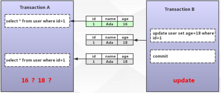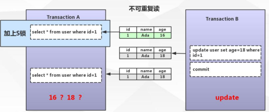 不可重复读:在一个事务中两次读取的结果内容不同