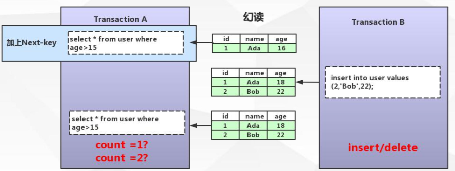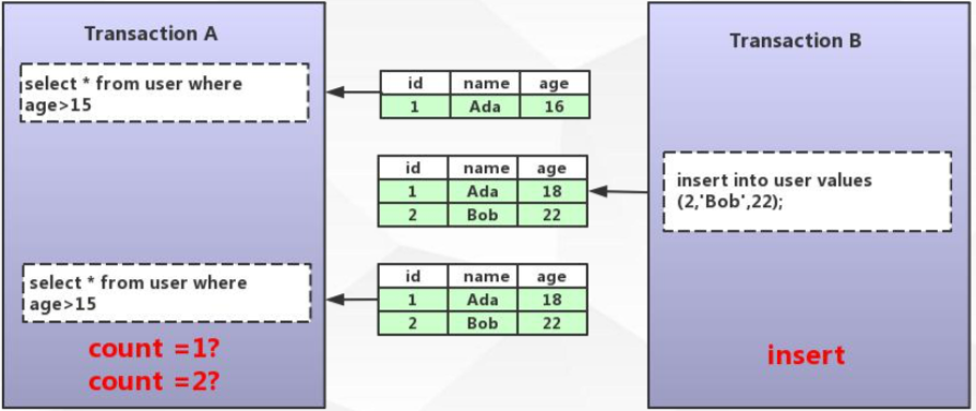 幻读:一个事务中两次读取的数据行数不同
