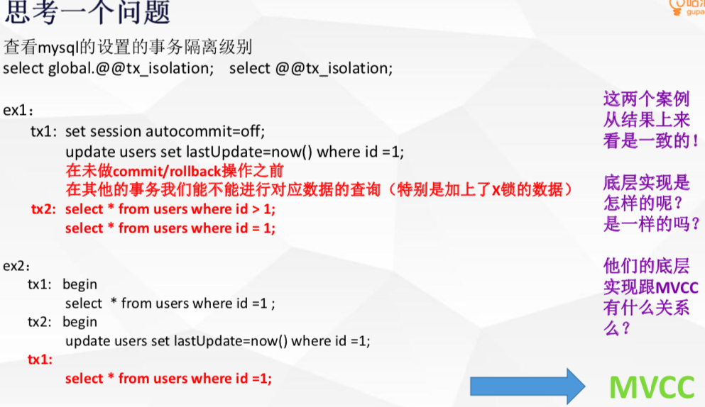 ex1与ex2 的实现方式完全不同:ex1 是进行当前读,通过锁机制来解决事务并发问题(新更新)