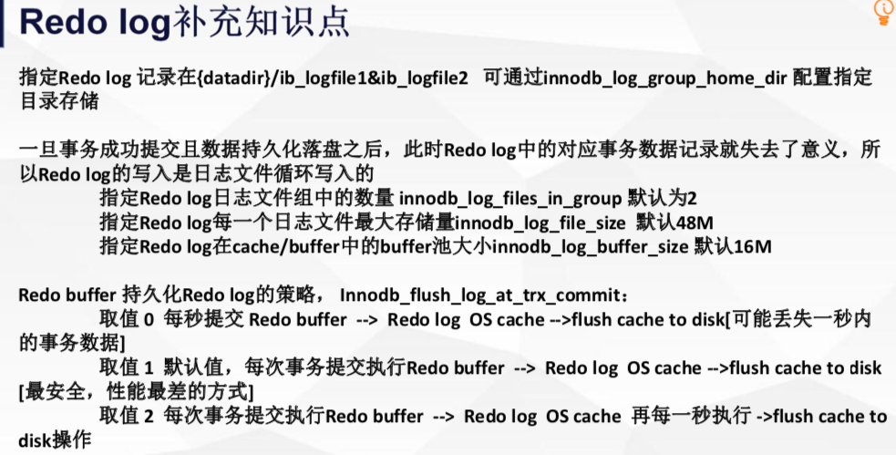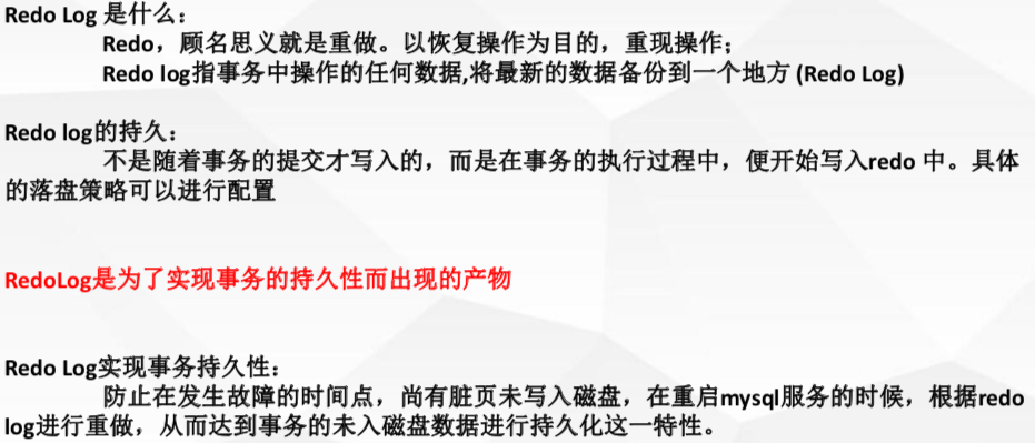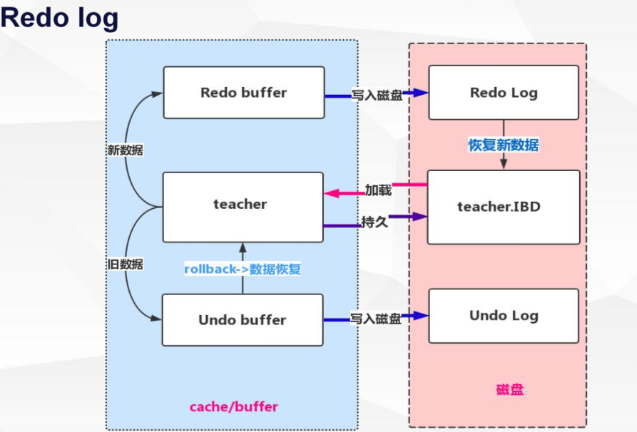 Redo就是重做,以恢复操作为目的,重现操作.将最新的数据备份到一个地方叫做redo-log,不是每一次commit操作都会刷到磁盘里,操作都会进行redo log 的记录,将最新的数据记录到redo-log中,当进行commit的时候,只要这些操作记录在redo log 中就代表执行成功了,但是数据并不一定马上刷到了磁盘里面。重启mysql 它会基于Redo Log进行数据的重做,把你提交的数据全部恢复到IDB 的数据库中去。Redo Log 是为了实现事务的持久性而出现的产物。Redo 也是IO 也耗时 但是redo 是一个顺序的IO ,redo 刷数据一定是随机IO ,Redo 将耗时的操作放在后台慢慢的去做,只要记录到了redo log 里面就数据库就保证数据是持久化的。脏页 什么时候去刷,什么时候去持久化。都无关紧要,耗时的逻辑放到后台跑。