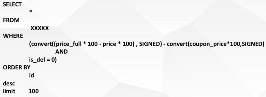 该条sql 语句的优化应该考虑在表中加一列,该列为price_full*100 - price * 100 的值,并在该列创建索引,来增加查询效率