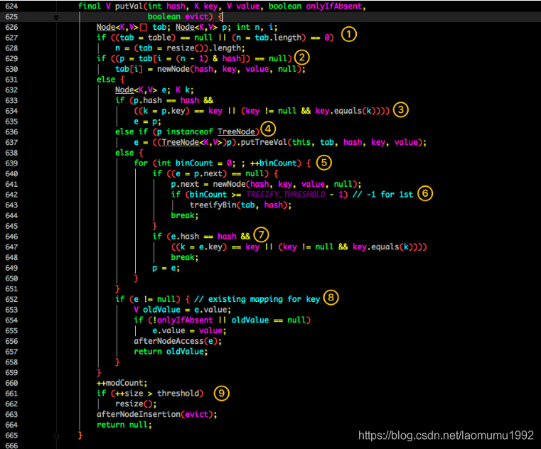 - 如果桶是一个链表则需要遍历判断里面的 hashcode、key 是否和传入 key 相等,如果相等则进行覆盖,并返回原来的值。