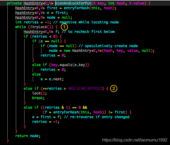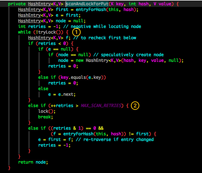 首先第一步的时候会尝试获取锁,如果获取失败肯定就有其他线程存在竞争,则利用 scanAndLockForPut() 自旋获取锁。