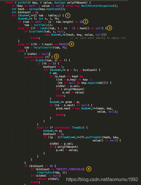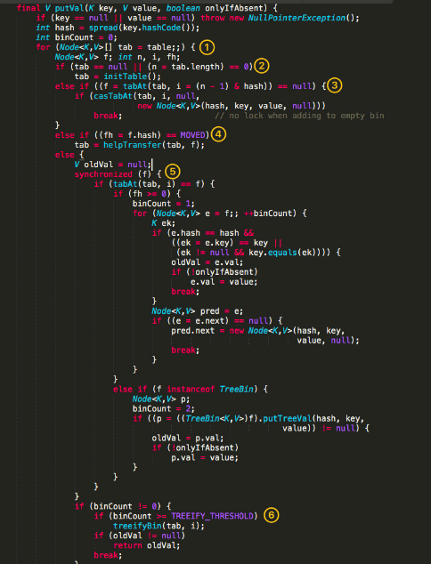 f即为当前 key 定位出的 Node,如果为空表示当前位置可以写入数据,利用 CAS 尝试写入,失败则自旋保证成功。- 如果当前位置的