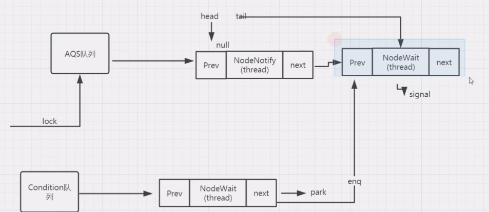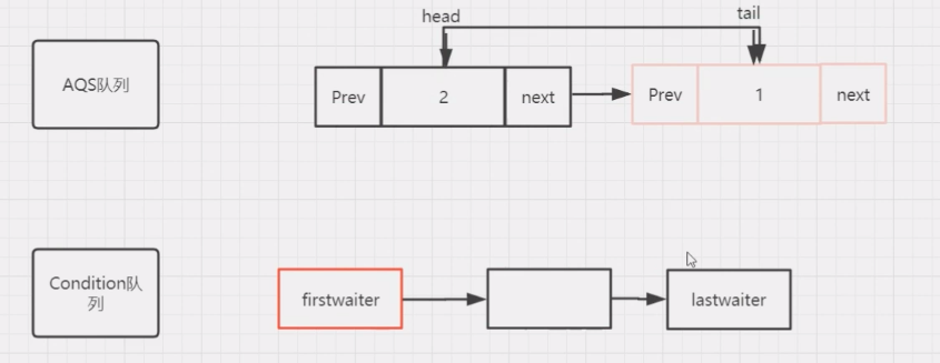 condition队列与AQS队列的转化和调用过程,当线程调用condiion.await()时封装该线程的Node节点会从AQS队列,加入到Condition队列中,当调用condition.signal()时,在Condition队列中的线程会重新回到AQS中。