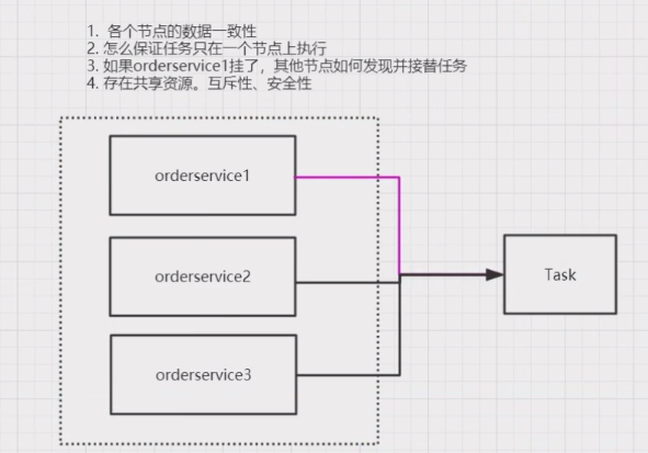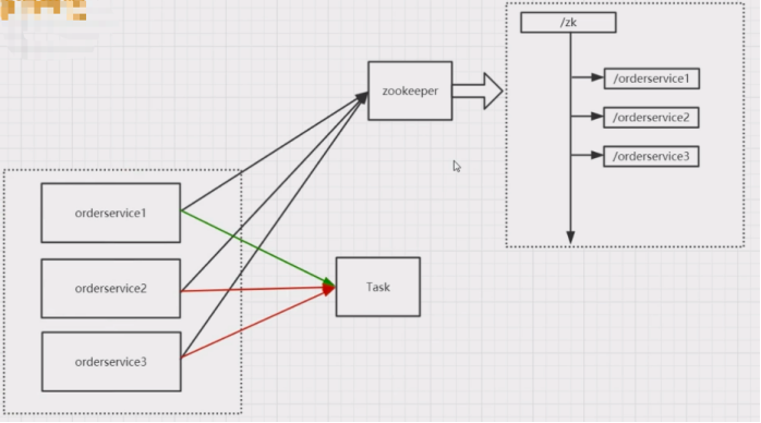 上面这个架构下 zookeeper ,可以用来解决 task 执 行问题,各个服务先去 zookeeper 上去注册节点,然后获 得权限以后再来访问 task。