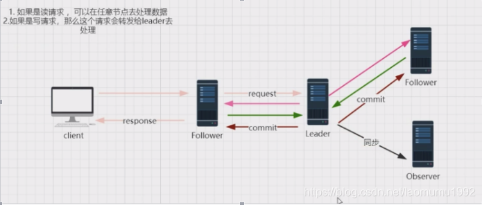 leader 的投票过程,不需要 Observer 的 ack,也就是 Observer 不需要参与投票过程,但是 Observer 必须要同 步 Leader 的数据从而在处理请求的时候保证数据的一致性