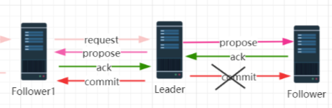 leader 对事务消息发起 commit 操作,但是该消息在 follower1 上执行了,但是 follower2 还没有收到 commit, 就已经挂了,而实际上客户端已经收到该事务消息处理成功的回执了。所以在 zab 协议下需要保证所有机器都要执 行这个事务消息