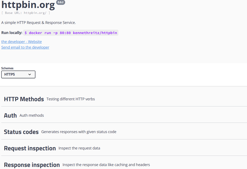 在完成了Jmeter元件的基础介绍后,在这里列举一个实际按理来方便大家对上述介绍的理论知识做一个基础的实践,实践时以Jmeter中最常用的HTTP取样器作为示例,在网址:https://httpbin.org/ 中提供了大量的HTTP请求和响应的模拟接口,读者们可以通过调用该网站提供的大量模拟接口来练习Jmeter性能测试脚本的编写,如下图所示,在这里我们从其中选取一个HTTPS的接口来作为演示的示例,演示接口的相关信息如下,接口详情如下图所示。