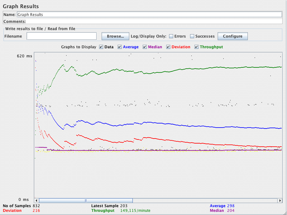 - 图形结果:用于生成一个简单的图形结果,图形中会展示所有取样器请求的耗时,单位为毫秒,在图形的底部会以黑色的形式显示每个取样器请求的耗时,会以蓝色来显示所有取样器请求的平均值,会以红色来显示耗时的标准偏差,会以绿色来显示当前的吞吐量,如下图所示,图中的吞吐量表示了所压测的服务器在单位时间内处理的实际请求数,图像结果的展示,可以更加直观的看到每个取样器请求的耗时情况以及观察性能指标曲线的走势来辅助判断可能存在的性能问题。由于图像展示通常需要消耗大量的CPU、内存等硬件资源,所以不建议在高并发的性能压测中,长时间使用图像结果展示,不然会让Jmeter 界面变得非常的卡顿。