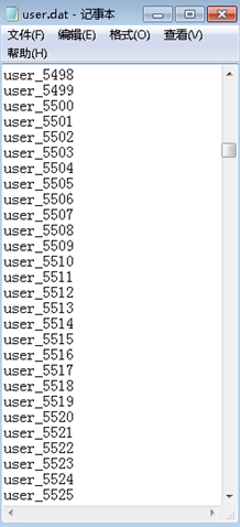 对上述SQL语句中的user_id进行参数化,准备好的参数化数据如下图所示,创建了一个user.dat文件用于存储参数化数据,参数化数据中使用字母和数字组合来生成供user_id使用的参数化数据。