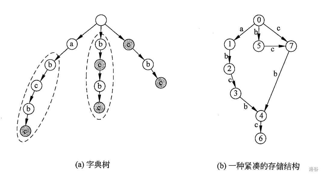 之前讨论过的自动机,诸如 AC 自动机和 PAM,它们的形态都类似于一棵 Trie 的形式,然后在其上添加了一些指针。而 SAM 比较特殊,它的形态是一个 DAG。因为,在一棵 Trie 上直接存储后缀是很浪费时间和空间的,约为 \(O(N^2)\)。而我们不需要开那么多无用的节点,只需用类似下图这样紧凑的存储方式即可:
