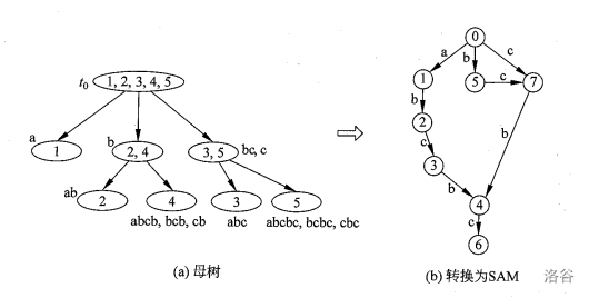 这棵母树又有很多有用的性质,我们暂且不表,先考虑怎么构建出右图这个 SAM。