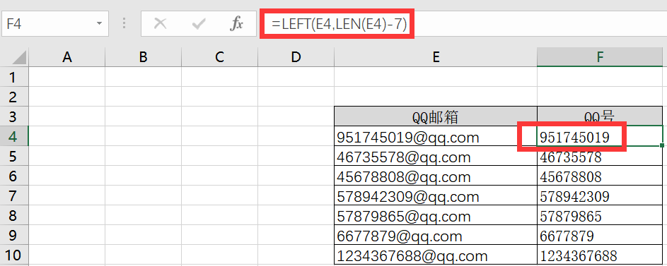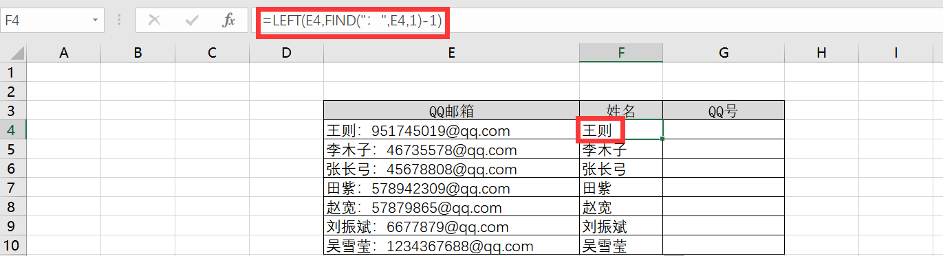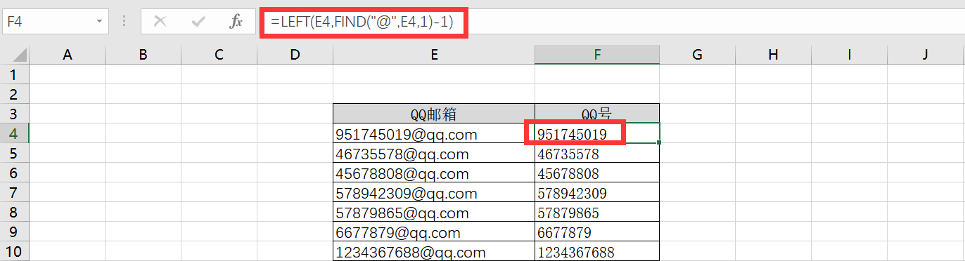 使用嵌套函数,=LEFT(E4,FIND("@",E4,1)-1),E4就是第1个QQ邮箱,LEFT里的第2个参数就是从左边数几个,因为qq号码长度不固定,嵌套了FIND函数,从E4里查找@,从第1个位置开始,查到@的位置然后-1,第2个参数也出来了