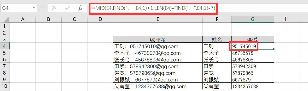 然后查找QQ号,mid函数第1个参数是传入的文本;第2个参数是从第4位开始,因为FIND(":",E4,1)查出来是3,所以要+1,从第4位开始;第3个参数就是开始后的长度,用总长度减去前面的长度,再减去7,QQ号就出来了