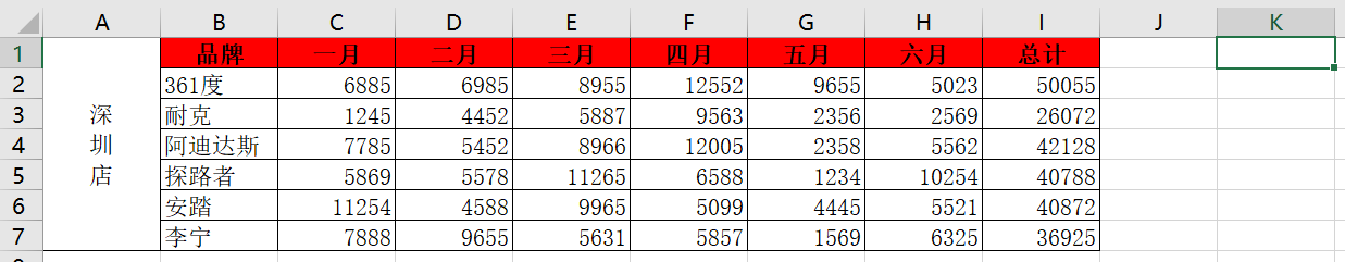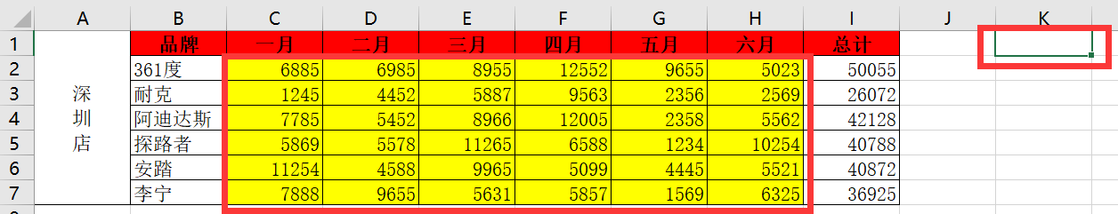 所有的数字被选中了,最后一列是公式,所以没有选中,点击开始,选择黄色背景,最后选中空单元格K1,点击开发工具->停止录制,切换到深圳店,再点击如下图: