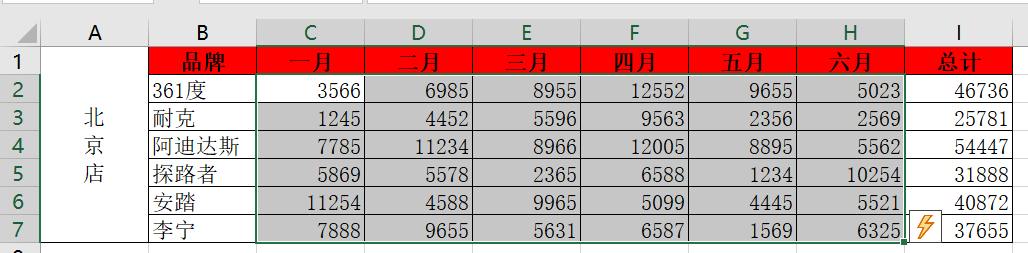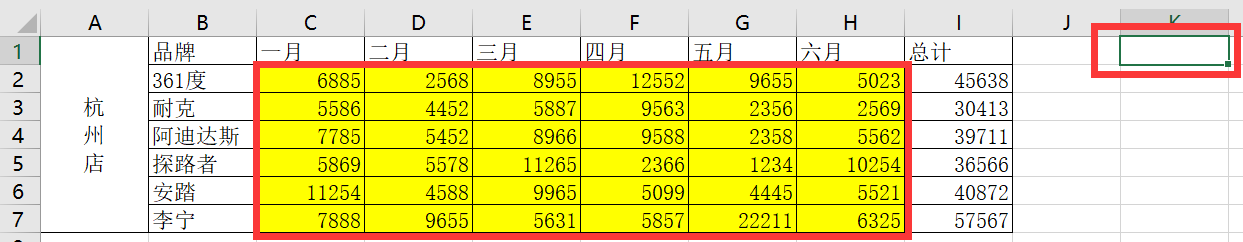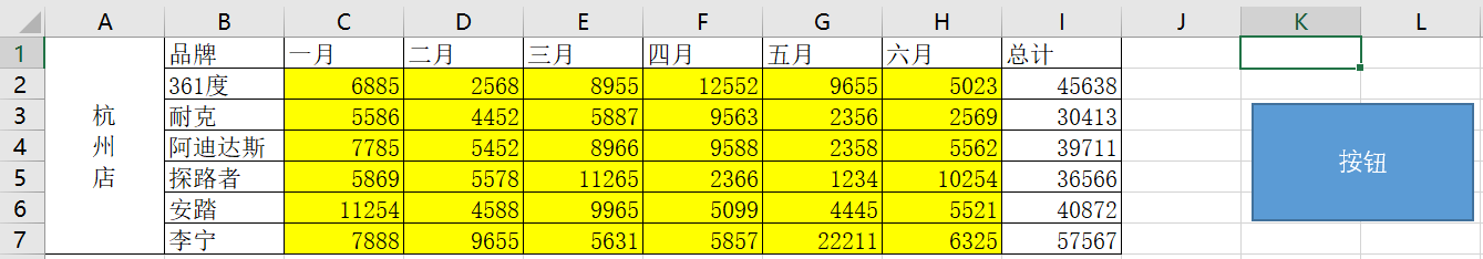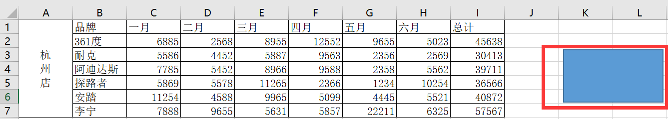 还可以自定义一个按键,先把杭州店恢复原状,选中所有数据,点击开始,背景颜色选择无填充颜色,点击插入->形状,插入一个矩形,然后在空单元格位置拖一下,生成一个矩形,如下图: