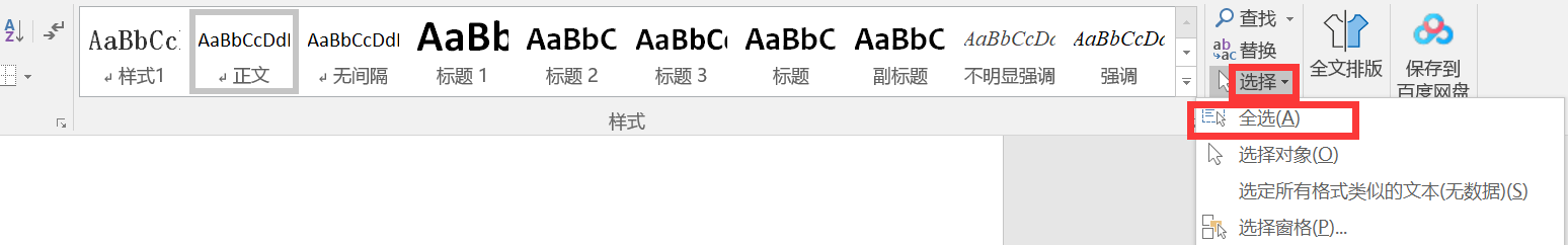 全选的三种方式:1、Ctrl+a 2、把鼠标放在第一个字,然后找到文件的最后一个字,按住Shift+鼠标即可 3、点击选择->全选,如下图: